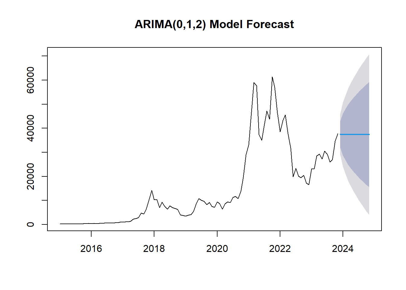 - Steady Price Increase: The point forecast predicts a steady increase in Bitcoin prices from approximately $36,803 in December 2023 to $37,310 in November 2024.